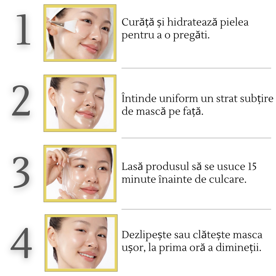 Pentru rezultate optime, se recomandă să integrați masca cu colagen în rutina de îngrijire de seară, 1–2 ori pe săptămână.